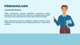Dokumen ini membahas pentingnya pengawasan dalam program pendidikan dan peran supervisor dalam pelaksanaannya. Terdapat dua teknik supervisi, yaitu teknik individu dan teknik kelompok, yang digunakan untuk meningkatkan kualitas pengajaran. Teknik-teknik ini meliputi kunjungan kelas, observasi, pertemuan orientasi, dan diskusi antara guru.