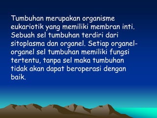 Organel-organel utama sel tumbuhan dan fungsinya meliputi dinding sel untuk memberi bentuk dan perlindungan, nukleus sebagai pengatur metabolisme dan pembawa informasi genetik, mitokondria untuk mensintesa ATP, ribosom untuk mensintesa protein, retikulum endoplasma untuk transportasi zat, badan Golgi untuk modifikasi protein, membran plasma sebagai pelindung dan pengatur pertukaran zat, sitoplasma sebagai tempat berlangsungnya metabolisme, vakuola untuk