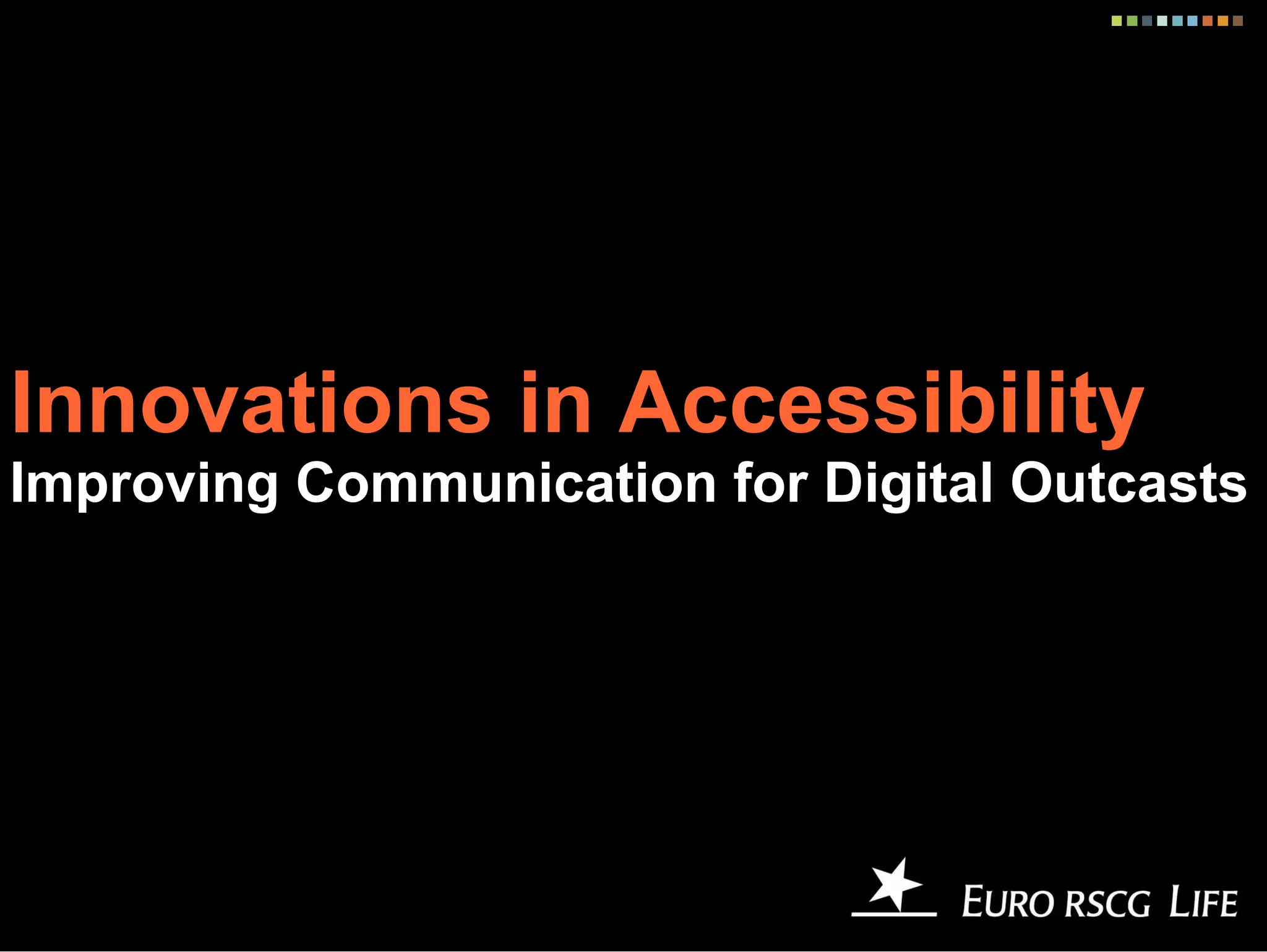 The document discusses various innovations in technology aimed at improving communication and accessibility for individuals with disabilities, often referred to as 'digital outcasts.' It shares testimonials and examples of apps and devices that have significantly enhanced the quality of life for users, demonstrating how technology can adapt to meet unique needs. Additionally, it highlights the broader implications of digital inclusion and the necessity of designing for diverse competencies.