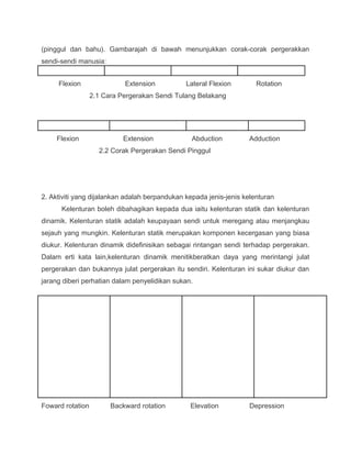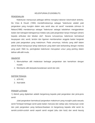 Kelenturan adalah kemampuan sendi dan otot untuk bergerak dalam julat pergerakan maksimum dan dibahagikan kepada kelenturan statik dan dinamik. Latihan kelenturan penting untuk meningkatkan prestasi atlet, mencegah kecederaan, serta menyokong pertumbuhan otot. Terdapat berbagai kaedah regangan, termasuk statik, dinamik, balistik, dan PNF, yang dapat digunakan untuk meningkatkan kelenturan.