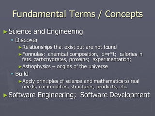The document outlines fundamental concepts of software engineering, emphasizing the need for systematic and evolutionary development processes to create high-quality software within constraints. It critiques traditional waterfall approaches for their limitations in addressing user needs and changing requirements, advocating for iterative and risk-driven methodologies instead. Key practices highlighted include developing iteratively, managing requirements effectively, and involving users closely throughout the development cycle.