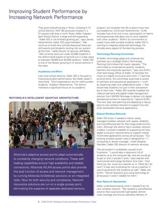 Keller Independent School District in Texas was growing rapidly and implementing a digital curriculum to improve student performance across its 36 campuses. It installed a video-on-demand solution but the legacy wireless network could not support it. Keller chose Motorola's 802.11n wireless LAN infrastructure with adaptive architecture to reliably deliver streaming video, applications, and large files to thousands of students. The high-performance network enhanced the digital learning experience.