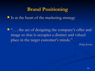 This document summarizes key concepts in brand positioning and brand audits. It discusses determining a brand's points of parity and points of difference compared to competitors. An effective brand positioning clearly defines the target market and competitive frame of reference. A brand audit examines both internal and external perceptions of a brand to understand its sources of equity and recommend strategies to maximize long-term value. The audit involves inventorying brand elements, exploring consumer perceptions, and identifying strengths, weaknesses, and opportunities.