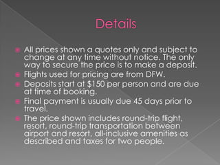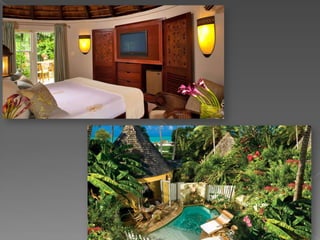 This document provides information about an all-inclusive vacation package to Sandals Grande Antigua Resort & Spa in Antigua. Some key details include: prices start at $9,932 for 9 nights in a Mediterranean honeymoon suite and $11,248 for 9 nights in a Caribbean honeymoon suite with a private pool; the resort has 373 rooms and suites, 6 pools, and included water activities; it offers a variety of dining options and entertainment each night including live shows and beach parties. Guests staying in butler suites receive personalized services like unpacking, meal delivery, and transportation arrangements.