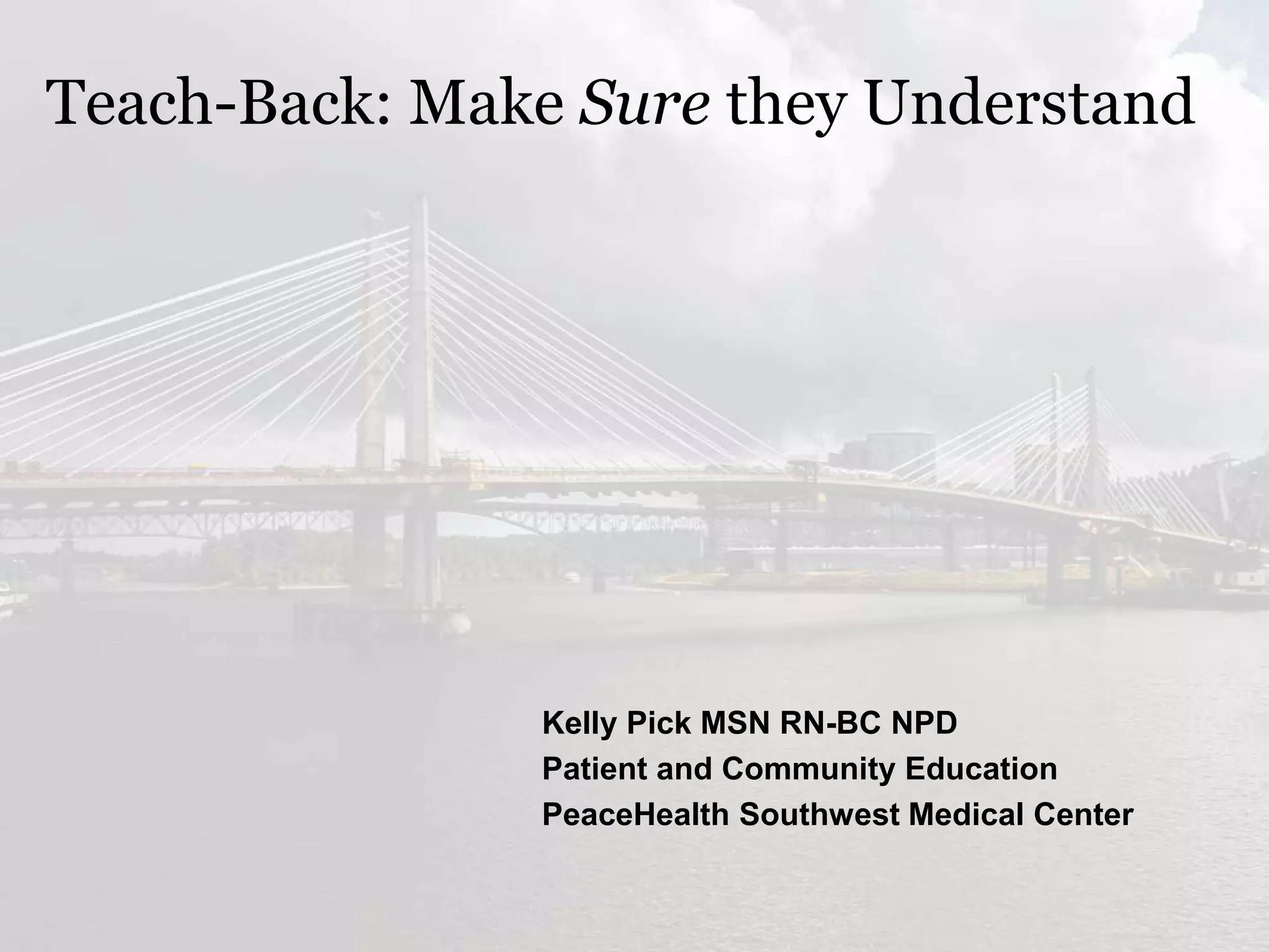 The document discusses the teach-back method, a communication strategy aimed at ensuring patients understand their health information and instructions. It emphasizes clear communication techniques, the importance of confirming comprehension, and the benefits of teach-back in improving patient safety and engagement. Key resources and tools for implementing teach-back in healthcare settings are also provided.
