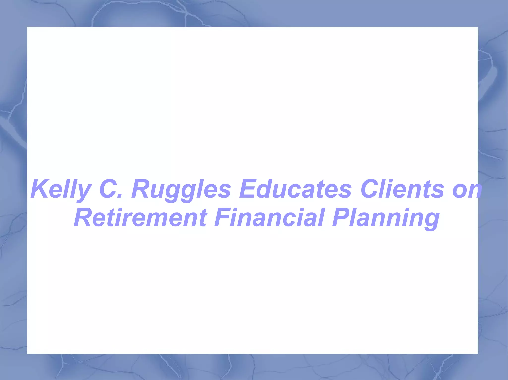 Kelly C. Ruggles is a fee-based financial educator from Spokane, Washington, with over 15 years of experience in retirement financial planning, having assisted more than 1,000 retirees. He emphasizes the necessity of customized retirement plans tailored to individual client needs and has authored a book titled 'Financial Concerns for Retirement' while also conducting workshops to educate clients. Ruggles operates under a ‘client need-based’ philosophy through his company, American Reliance Group Inc.