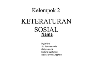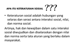 Keteraturan sosial terbentuk dari interaksi sosial yang diatur oleh norma dan aturan yang berlaku, mencapai tahap tertib sosial, keajegan, dan pola. Faktor penghambatnya adalah persaingan dan konflik, sementara kerjasama dan akomodasi mendorong tercapainya keteraturan.