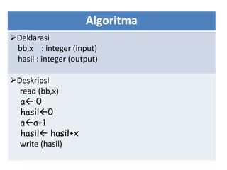 Dokumen ini menjelaskan algoritma untuk menjumlahkan bilangan input dalam pemrograman C++. Algoritma menggunakan perulangan hingga batas yang ditentukan oleh pengguna untuk menghitung total. Hasil akhirnya adalah jumlah dari semua bilangan yang diinputkan oleh pengguna.