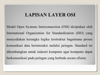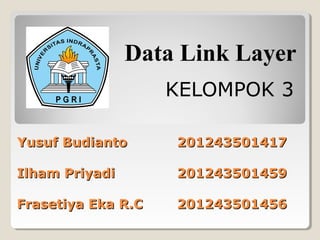Dokumen tersebut membahas tentang Data Link Layer pada model OSI. Pada layer ini, data diterima dari network layer berupa paket yang kemudian diencapsulasi menjadi frame dengan menambahkan layer-2 header sebelum dikirim ke physical layer. Protokol jendela geser digunakan untuk mengirim frame secara berurutan.