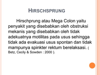 Dokumen tersebut membahas tentang penyakit Hirschsprung pada anak, yang disebabkan oleh ketidakcukupan syaraf pada usus besar bagian bawah sehingga menyebabkan obstruksi. Dibahas pula gejala, diagnosis, klasifikasi, faktor risiko, komplikasi, penatalaksanaan, dan asuhan keperawatan pada penyakit tersebut. Kelompok 3 membahas topik ini dengan dosen pembimbing Ibu Henik Istikhomah.