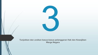 Dokumen tersebut membahas berbagai kasus pelanggaran hak asasi manusia dan pengingkaran kewajiban warga negara di Indonesia, seperti hukuman mati, pelanggaran hak dalam pemilihan kepala daerah, penggusuran rumah, pelanggaran hak cipta, dan lainnya. Dokumen tersebut juga menjelaskan faktor-faktor penyebab dan langkah-langkah yang dapat dilakukan pemerintah untuk mengatasi masalah tersebut