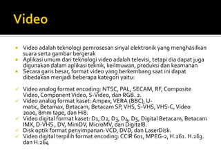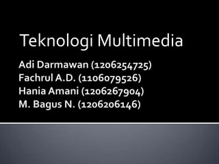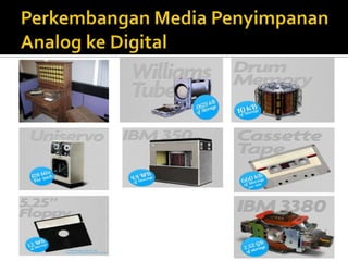 Dokumen ini membahas berbagai teknologi multimedia, termasuk format video analog dan digital, serta media penyimpanan seperti floppy disk, hard disk, dan flash disk. Diterangkan pula tentang sejarah media penyimpanan dan syarat penyimpanan film yang benar. Selain itu, dokumen ini mencakup kelebihan dan kekurangan film dalam menyampaikan pesan.