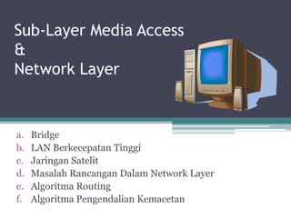 Dokumen ini membahas tentang berbagai aspek jaringan, termasuk sub-layer media access, algoritma routing, dan fungsi alat seperti bridge dalam memperbaiki efisiensi jaringan. Jaringan dibagi menjadi koneksi point-to-point dan saluran broadcast, serta menjelaskan protokol seperti FDDI, Fast Ethernet, dan HIPP yang digunakan untuk transfer data berkecepatan tinggi. Terdapat juga penjelasan mengenai masalah rancangan pada network layer dan algoritma pengendalian kemacetan dalam jaringan.