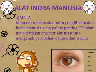 Dokumen tersebut membahas tentang alat indra manusia khususnya mata. Mata terdiri dari bagian luar dan dalam, dengan bagian dalam meliputi kornea, iris, pupil, lensa mata, retina, dan lainnya. Dokumen ini juga menjelaskan berbagai kelainan penglihatan seperti miopia, hipermetropia, presbiopia, astigmatisme, dan lainnya beserta penjelasan singkat mengenai penyebab dan cara penanganannya.