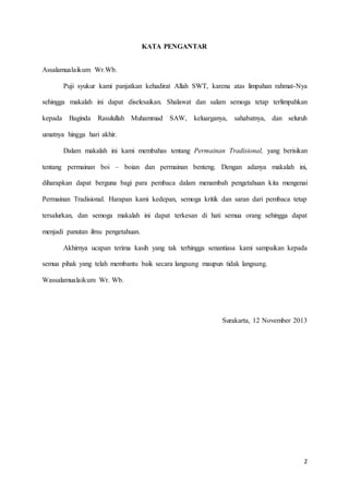 Makalah ini membahas dua permainan tradisional yaitu boi-boian dan benteng. Permainan boi-boian berasal dari Jawa Barat yang melibatkan dua kelompok yang saling melempar bola kertas untuk menjatuhkan menara batu lawan. Sedangkan permainan benteng melibatkan dua kelompok yang saling berusaha menyentuh markas lawan dengan aturan tertentu. Kedua permainan bertujuan untuk mengasah kerja sama, ketelit