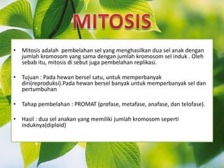 Mitosis adalah pembelahan sel yang menghasilkan dua sel anakan yang memiliki jumlah kromosom yang sama dengan sel induk. Terdiri dari empat tahap yaitu profase, metafase, anafase, dan telofase. Hasil akhirnya adalah terbentuknya dua sel anakan baru yang memiliki kromosom sebanyak sel induknya.