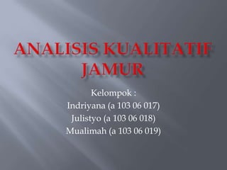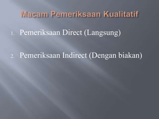 Dokumen ini menjelaskan prosedur pemeriksaan mikroskopis berbagai sampel biologis dari lesi kulit, kuku, rambut, dan lainnya untuk mengidentifikasi jenis jamur dan mikroorganisme. Sampel-sampel tersebut diproses melalui teknik pengambilan dan media kultur, diikuti oleh pengamatan mikroskopis yang menghasilkan identifikasi spesies tertentu seperti Epidermophyton floccosum dan Candida albicans. Langkah-langkah dilakukan dengan hati-hati untuk memastikan akurasi dan keandalan hasil yang diperoleh.