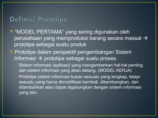 Dokumen ini membahas tentang metode prototyping dalam pengembangan sistem informasi, yang mencakup langkah-langkah seperti identifikasi kebutuhan, desain cepat, dan evaluasi pengguna. Terdapat berbagai jenis prototyping, termasuk throw-away, incremental, dan evolutionary, masing-masing dengan karakteristik dan kegunaannya sendiri. Prototyping memungkinkan keterlibatan pengguna dan fleksibilitas dalam pengembangan, meskipun juga memiliki kekurangan terkait ekspektasi pengguna dan potensi terburu-buru dalam implementasi.