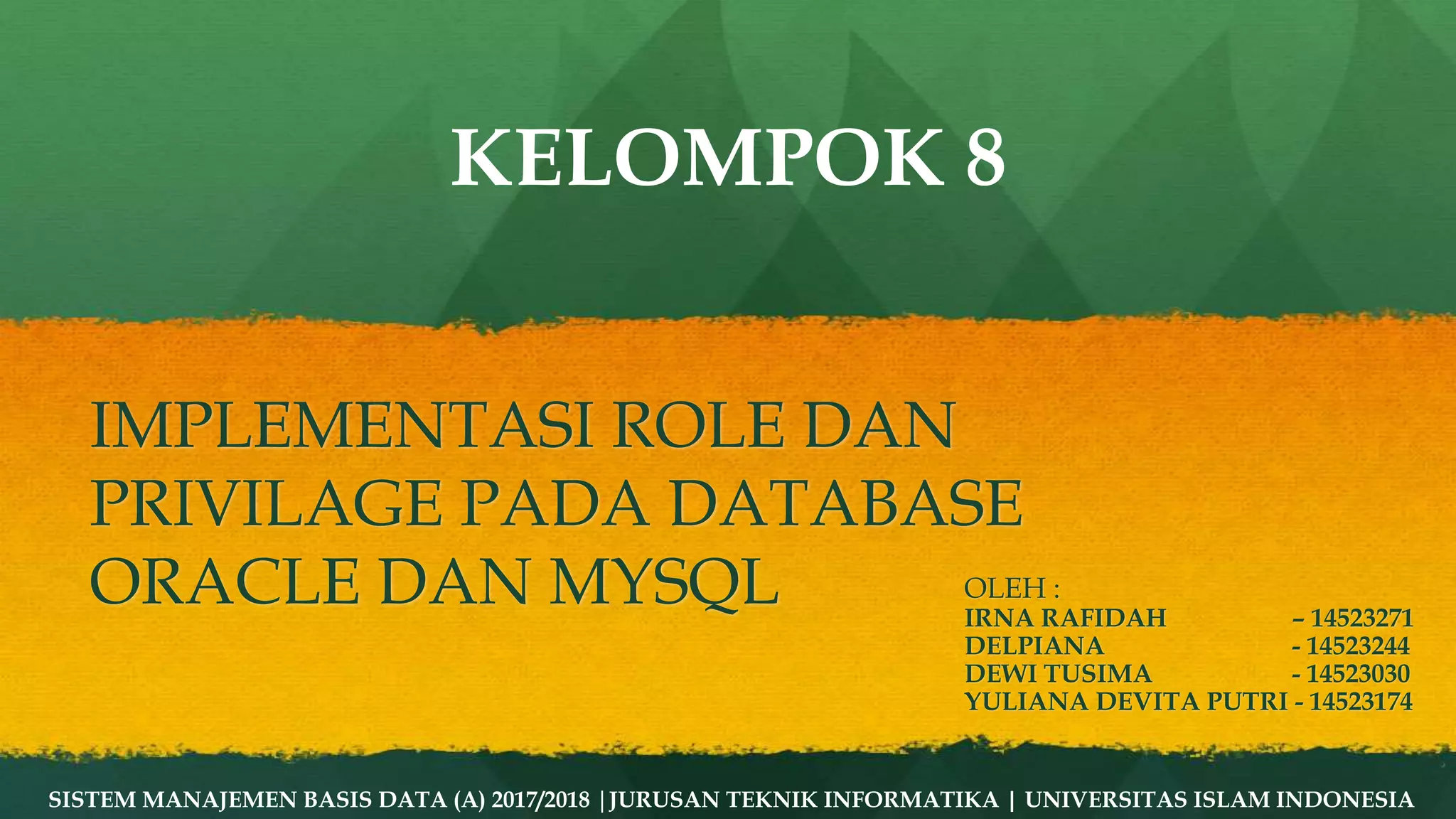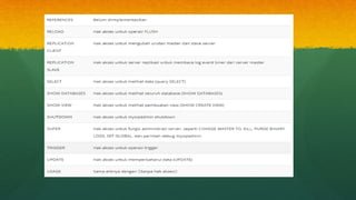 Dokumen ini membahas implementasi role dan privilege pada database Oracle dan MySQL, menjelaskan perbedaan antara privilege akses dan role yang merupakan kumpulan privilege. Oracle menawarkan sistem privilege yang lebih kompleks dengan kemampuan untuk membuat role, sementara MySQL tidak memiliki konsep role dan hak akses diberikan satu per satu. Contoh penggunaan privilege di masing-masing database juga diuraikan dalam dokumen.