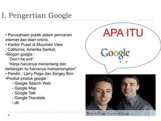 Dokumen ini menjelaskan tentang Google sebagai perusahaan publik yang berfokus pada pencarian internet dan iklan online, serta menguraikan produk dan layanan seperti B2B dan B2C. Layanan B2B mencakup transaksi antar perusahaan dan cloud computing, sementara layanan B2C memungkinkan konsumen untuk membeli produk secara elektronik. Google menghasilkan keuntungan lebih dari layanan B2B melalui inovasi, sementara layanan B2C disediakan secara gratis untuk pengguna.