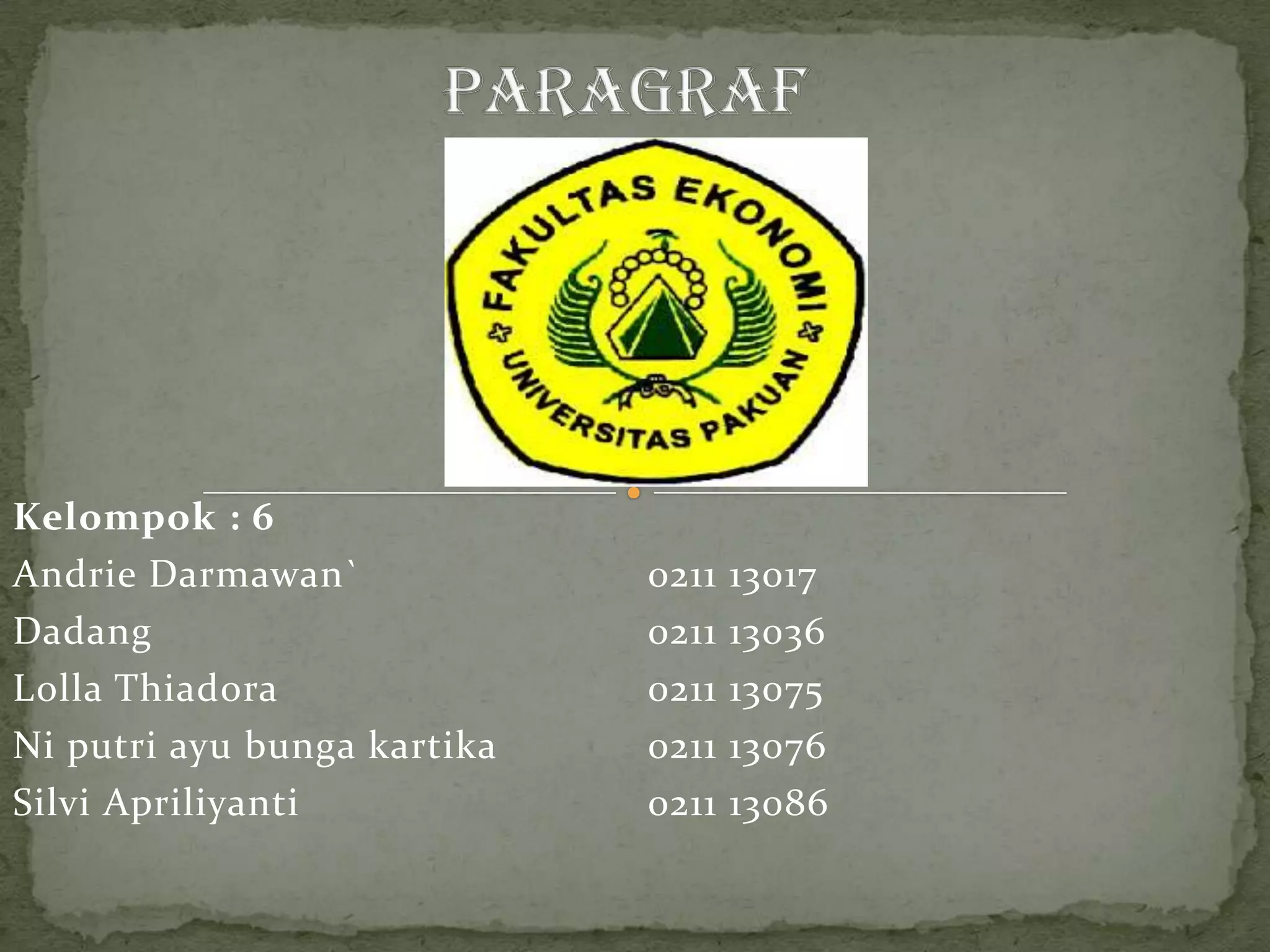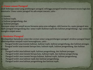 Paragrafterdiri atas kalimat topik atau kalimat pokok dan kalimat penjelas atau kalimat