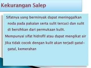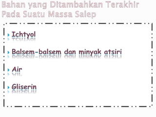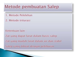 Dokumen ini menjelaskan tentang salep sebagai sediaan setengah padat untuk pemakaiannya secara topikal, termasuk definisi, klasifikasi, dan peraturan pembuatan salep. Dasar salep dibagi menjadi empat kelompok dan terdapat beberapa zat berkhasiat yang dapat digunakan dalam salep. Selain itu, dokumen juga mencakup standar pembuatan dan penandaan salep yang harus dipatuhi.