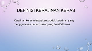 Dokumen ini membahas tentang kerajinan keras, yang mencakup kerajinan alami dan buatan, serta fokus pada kerajinan semen sebagai bahan dasar. Selain itu, dijelaskan tentang cara membuat tempat sampah dari semen dan faktor-faktor yang mempengaruhi keberhasilan serta kegagalan dalam kewirausahaan. Terdapat juga analisis mengenai perencanaan biaya produksi dalam usaha kerajinan.