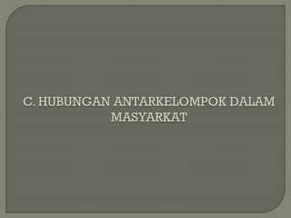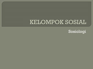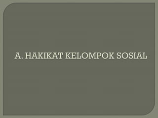 Dokumen tersebut membahas tentang konsep kelompok sosial menurut para ahli, termasuk definisi, jenis, karakteristik, dan hubungan antar kelompok sosial. Beberapa poin penting yang diangkat adalah perbedaan antara kelompok primer dan sekunder, kelompok mekanik dan organik, serta proses interaksi antar kelompok seperti akulturasi, dominasi, dan integrasi.