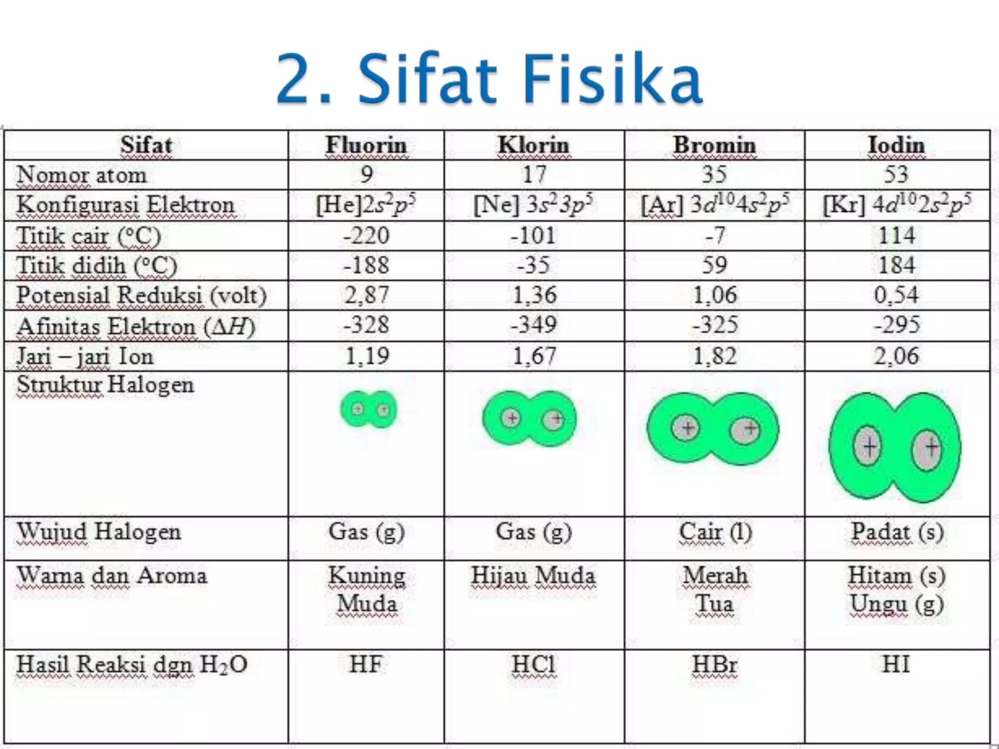 Dokumen ini membahas tentang unsur halogen dalam sistem periodik, mencakup sifat-sifat fisika dan kimia dari unsur-unsur tersebut seperti energi ionisasi, afinitas elektron, dan daya reaksi. Halogen memiliki karakteristik reaktivitas yang menurun dari atas ke bawah golongan, dan digunakan dalam berbagai aplikasi industri dan kesehatan. Selain itu, reaksi-reaksi halogen dengan berbagai senyawa serta dampak penggunaannya, seperti pada lapisan ozon, juga dijelaskan.