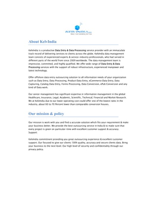 KelvIndia is a data entry and data processing service provider that has served clients globally since 2009. It offers a wide range of data services including data entry, data processing, ecommerce catalog management, and back office support. KelvIndia aims to provide high quality, accurate, and affordable outsourcing solutions while maintaining strong customer support and confidentiality.