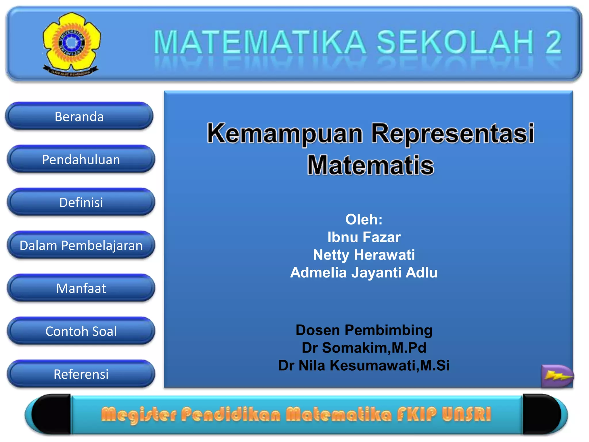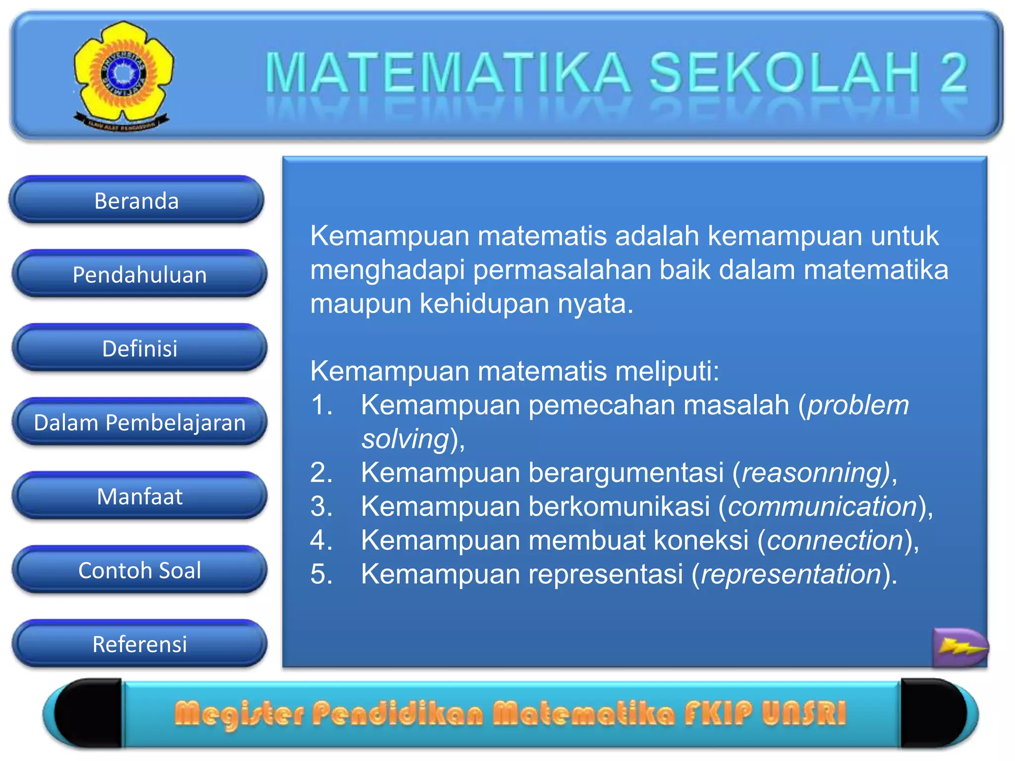 Dokumen ini membahas definisi dan manfaat kemampuan matematis serta representasi dalam pembelajaran matematika. Kemampuan matematis mencakup berbagai aspekt seperti pemecahan masalah dan komunikasi, sedangkan representasi berfungsi untuk menggambarkan ide matematika dengan cara yang berbeda. Manfaat dari representasi dalam pembelajaran termasuk meningkatkan pemahaman siswa dan meminimalkan kesalahan konsep.