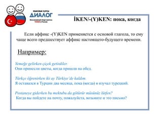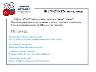 Аффикс -(y)ken в турецком языке используется для обозначения действия, происходящего 'пока' или 'когда'. Он не подчиняется правилам гармонии и всегда сохраняет свою форму, при этом слог перед ним ударный. Примеры использования включают ситуации, когда одно действие происходит одновременно с другим, например, 'мы посетили все музеи, пока были в Стамбуле'.