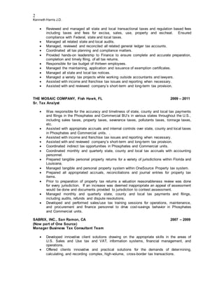 Kenneth Harris has over 20 years of experience in indirect taxes including sales, use, property, payroll and income taxes. He is currently the Indirect Tax Manager at John Bean Technologies where he manages a team of seven professionals and is responsible for transaction tax compliance across nine business units. Prior to this role, he worked as a Tax Consultant and held tax management roles at various companies where he managed teams, ensured tax compliance, identified tax savings opportunities, and handled audits.