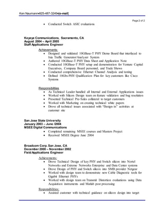 Ken Naumann has over 25 years of experience in Ethernet and networking hardware design. He currently works as a Catalyst Switching Technical Leader at Cisco, where he has helped design and develop several enterprise switches and modules. Previously, he held engineering roles at Keyeye Communications, Broadcom, National Semiconductor, and worked on his MSEE in digital communications. He has expertise in Ethernet PHY and channel design, coding theory, and test automation.