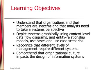 This document discusses understanding organizational style and its impact on information systems. It describes organizations as composed of interrelated subsystems that are influenced by levels of management and organizational culture. It also summarizes different ways to graphically depict organizational systems, including using data flow diagrams, entity-relationship models, and use case modeling. Finally, it outlines how the three levels of management (operational, middle, and strategic) require different systems and how organizational culture impacts information system design.
