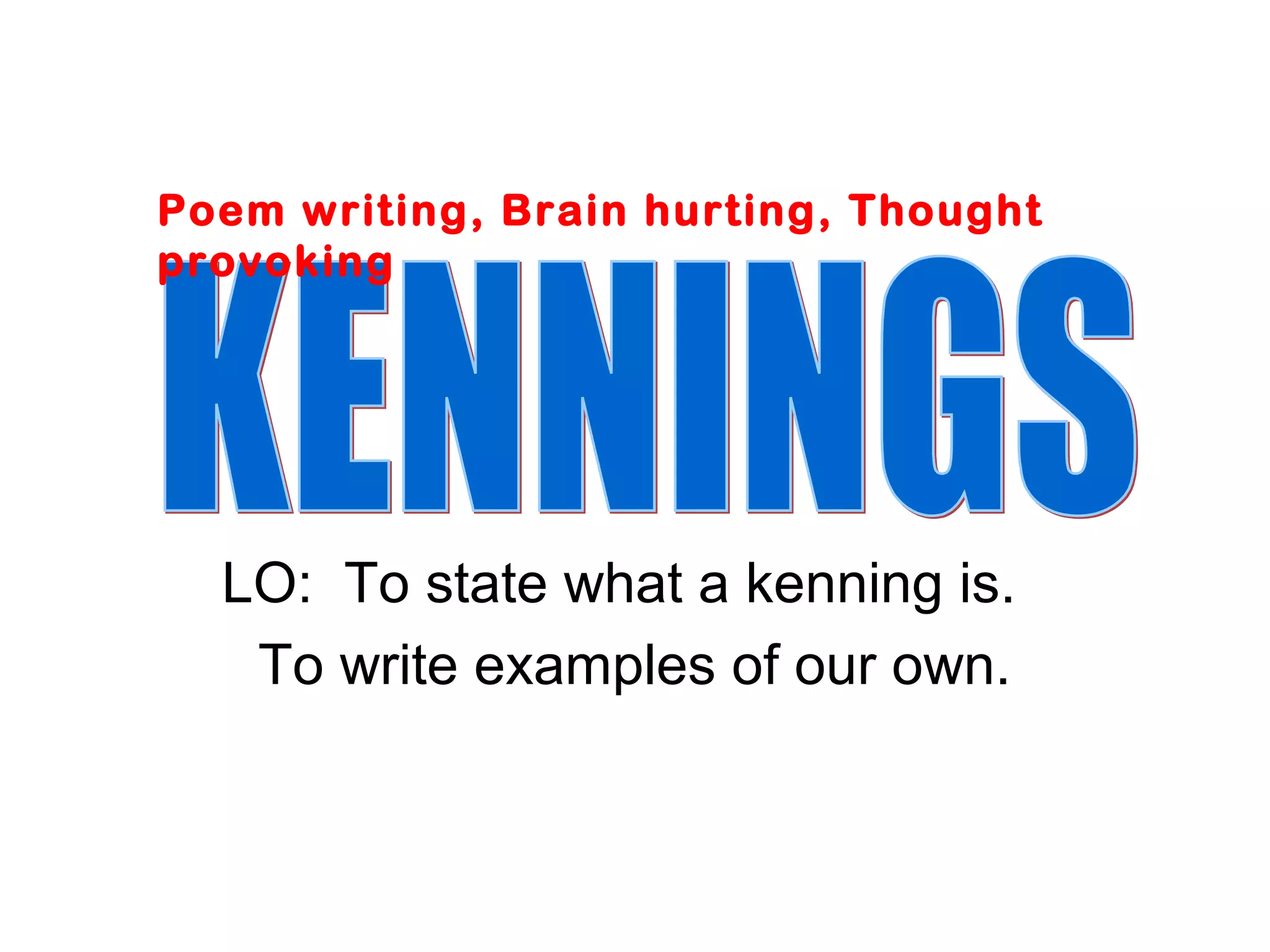 A kenning is a poetic device used in Old Norse and Old English poetry where something is described indirectly using descriptive phrases rather than directly stating what it is. The summary provides examples of kennings such as "heat giver" for fire and "light maker" for the sun. The document teaches how to write kennings by thinking of a subject and describing what it does using two-word phrases. It then provides examples of kennings for various subjects like a dog, ball, parent, and teacher.