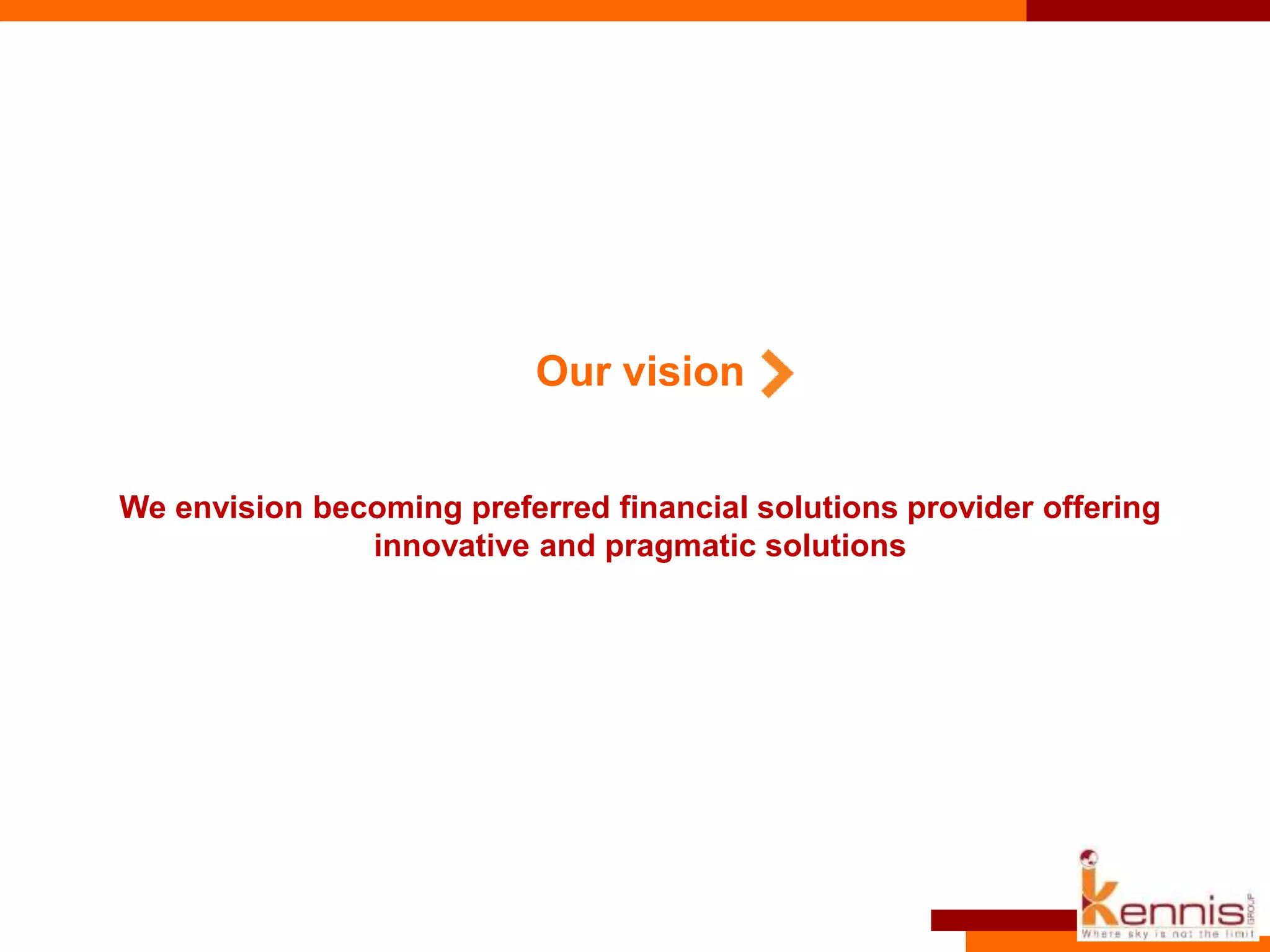 Kennis Group aims to be the preferred provider of innovative financial solutions, offering a comprehensive range of services tailored to client needs, including compliance and risk management, project financing, and advisory for emerging corporates. The company is supported by a highly skilled team, led by experienced finance professionals with extensive expertise in various sectors, aiming to deliver significant value and fast-paced growth for clients. Kennis additionally focuses on nurturing entrepreneurship by providing strategic assistance and collaborating with institutions like IIT Mumbai.