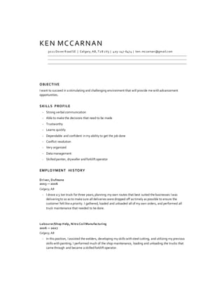 Ken McCarnan is seeking a stimulating and challenging position that offers advancement opportunities. He has strong communication, decision-making, and organizational skills. His work history includes driving trucks for deliveries and ensuring timely customer service, assisting welders by performing maintenance, loading/unloading, and operating forklifts, and being self-employed in drywalling and painting for 8 years developing expertise in those trades. He has a GED and references available.