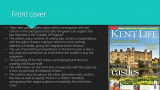 The regional magazine Kent Life targets an older audience living in Kent, England. The front cover uses green and yellow colors that correspond to the natural beauty of Kent, known as the "Garden of England." It promotes competitions to attract readers and features content like wine and references to "mums" to anticipate its target demographic. Inside, pictures of green Kent landscapes and attractions like Dover Castle reinforce the focus on the region. Articles are separated into topics of interest for older audiences like countryside life and gardening. Advertisements similarly feature iconic places from Kent like Dover Castle to appeal to the target audience's interests in history.