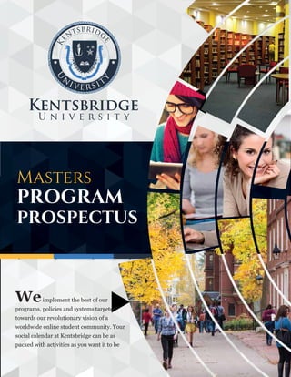The document provides information about the Masters degree programs offered at Kentsbridge University. It summarizes the benefits of obtaining a Masters degree, as well as details several specific Masters programs being offered in various fields like business administration, management, computer science, and more. It emphasizes that the programs are designed for working professionals to help advance their careers with additional skills and knowledge. Student testimonials are also included praising the education received from Kentsbridge University.