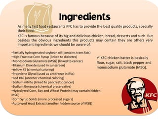 Kentucky Fried Chicken uses several controversial ingredients and production practices. The document outlines that KFC chicken is battered with flour, sugar, salt, black pepper and MSG. However, their meat also comes from chickens that are injected with hormones and antibiotics to grow quickly, often resulting in broken bones. Their production process and ingredients have also faced criticism for their negative health impacts and inhumane treatment of chickens.