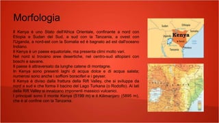 Il Kenya è un paese dell'Africa orientale con una morfologia variegata, che include montagne, laghi e una lunga costa. La sua storia è segnata da colonizzazioni, movimenti di resistenza e una transizione verso la democrazia multipartitica. Oggi, il Kenya vanta una popolazione in crescita, una cultura eterogenea e rilievi politici significativi.