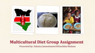 This document provides information about traditional foods in Kenya through a group presentation. It discusses the location and climate of Kenya and notes that staple foods consist mainly of corn, maize, potatoes, and beans. Four influences on Kenyan food choices are identified: climate, religion, economics, and geography. Examples of typical breakfast, lunch, and dinner foods are described. The document also compares Kenya's food guide to Canada's and discusses strengths and concerns of Kenya's diet as well as where to find Kenyan food in Toronto.