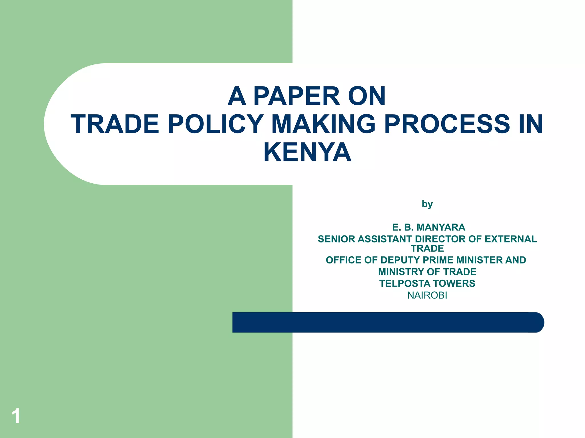 Kenya has evolved its trade policies over time from import substitution in the 1960s-1980s to trade liberalization under structural adjustment policies in the 1980s to export oriented policies in the 1990s. Vision 2030 now aims to transform Kenya into a globally competitive economy through a national trade policy. The trade policy making process involves identifying problems, benchmarking against other countries, and outlining goals, objectives, strategies and projects with input from stakeholders to support informal trade, retail, distribution, international trade, e-commerce and services. The Office of the Deputy Prime Minister and Ministry of Trade leads this process working with other ministries.
