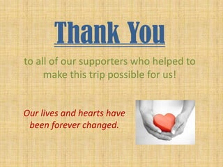 The document summarizes Isch's mission trip to Kenya in October 2011 to work with Living Room Ministries and Kimbilio Hospice. Some key points: