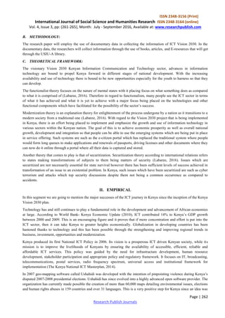 This document discusses Kenya's Vision 2030 plan to transform the country into a regional ICT hub. It provides an overview of Kenya's progress in developing its ICT sector since the 1990s through policy changes and infrastructure developments. Examples of Kenya's ICT achievements are highlighted, such as M-Pesa, Ushahidi, and growth in the business process outsourcing sector. The feasibility of Kenya achieving its Vision 2030 ICT goals is analyzed based on the contribution of ICT to GDP, innovations, and job growth seen over the past decade.