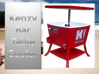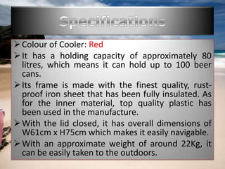 The document describes a red cooler with an 80-litre capacity, designed to hold up to 100 beer cans. It features a rust-proof iron frame, high-quality plastic interior, and comes with an umbrella holder, bottle opener, catch bucket, and magazine rack. The cooler is lightweight, easy to transport, requires minimal assembly, and keeps drinks chilled approximately 30% longer.