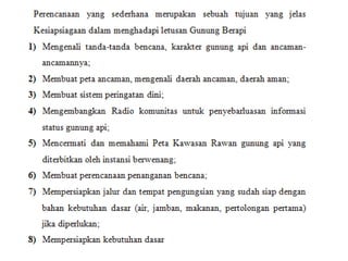 Dokumen tersebut membahas tentang gunung berapi di Indonesia, jenis-jenis gunung berapi, hasil letusan gunung berapi, dan manajemen bencana gunung berapi meliputi tahap pra-bencana, saat bencana, dan pasca bencana."