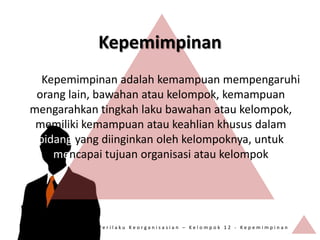 Dokumen tersebut membahas tentang kepemimpinan dan teori-teori kepemimpinan. Beberapa teori kepemimpinan yang disebutkan antara lain teori sifat, teori perilaku, teori situasi, dan teori kelompok. Selain itu, dibahas pula gaya-gaya kepemimpinan seperti otokratis, partisipatif, dan kendali bebas. Dokumen berisi penjelasan mengenai kepemimpinan yang efektif serta studi kasus