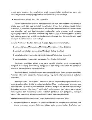 Dokumen tersebut membahas tentang kepemimpinan pendidikan dan berbagai model kepemimpinan yang relevan dalam pendidikan, seperti kepemimpinan visioner dan transformasional. Dibahas pula prinsip, syarat, dan fungsi kepemimpinan pendidikan serta gaya kepemimpinan otoriter, demokratis, dan laissez-faire.
